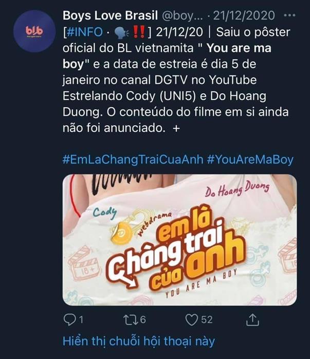 “Em là chàng trai của anh” hiện đang là web drama boylove được đông đảo khán giả yêu thích. Không chỉ fan Việt mà cộng đồng fan boylove quốc tế cũng hưởng ứng nhiệt tình, liên tục theo dõi từng tập phát sóng và dành nhiều lời khen ngợi. Ngoài kịch bản được nhận xét đầu tư bài bản, dễ lấy cảm xúc người xem và đánh trúng tâm lý các “chúng hủ” thì đôi nam chính - Cody (Uni5) và Đỗ Hoàng Dương cũng nhận rất nhiều tình cảm yêu mến từ khán giả.