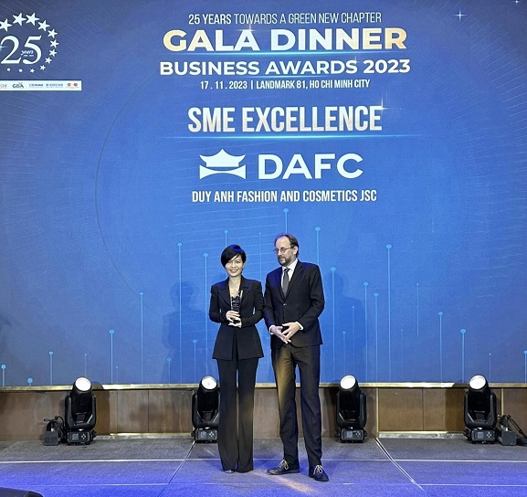 Tintuc - Vừa qua, Công ty Thời Trang và Mỹ Phẩm Duy Anh – DAFC tiếp tục ghi danh bảng vàng dưới sự điều hành của CEO Tiên Nguyễn với danh hiệu “SME Excellence” năm 2023 do Eurocham – Hiệp hội doanh nghiệp châu Âu trao tặng.