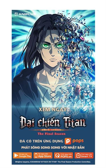 Tập mở đầu của Đại Chiến Titan mùa cuối phần 2 sẽ có tên là Condemnation, được phát sóng song song cùng lịch chiếu của Nhật Bản. Khán giả Việt sẽ là một trong những người đầu tiên được thưởng thức trọn phần cuối của phim với phiên bản lồng tiếng độc quyền trên ứng dụng giải trí POPS từ ngày 10.1.2022 tại link: https://pops.vn/series/attack-on-titan-dai-chien-titan