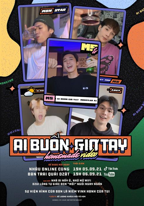 Tintuc - Chiều ngày 4/9, MONSTAR bất ngờ chia sẻ thư mời độc đáo trên fanpage của nhóm, dành riêng cho buổi công chiếu phiên bản Homemade Video của ca khúc Ai Buồn Giơ Tay. Trong tình hình giãn cách xã hội và không thể gặp nhau trực tiếp, MONSTAR quyết định tổ chức một buổi nhậu online cùng người hâm mộ vào lúc 19 giờ ngày 5/9 tại kênh YouTube và TikTok của ST.319 Entertainment.