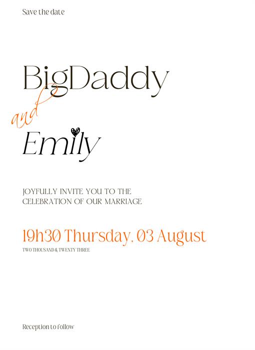 Thiệp cưới được bộ đôi “mượn rượu tỏ tình" thiết kế với phong cách tối giản cùng tông màu trắng chủ đạo. Không chỉ tạo nên cơn sốt ngay khi đăng tải, thiệp cưới còn được các nghệ sĩ của showbiz Việt chia sẻ và bày tỏ sự nôn nóng với lễ cưới đặc biệt này của cặp đôi BigDaddy - Emily, trong đó phải kể đến Suboi, Andree, gia đình Justatee - Trâm Anh, Huyme - Hàn Hằng, Trang Lou - Tùng Sơn…