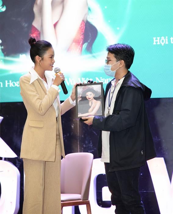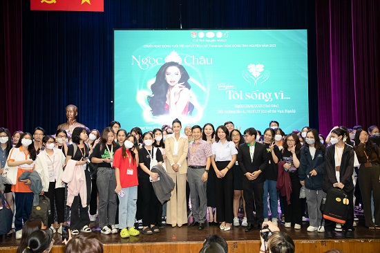 Talkshow diễn ra vào ngày 28/4 tại Huflit, hội trường được lấp đầy khán giả và nhận được sự hưởng ứng tích cực của đông đảo sinh viên. Xuất hiện trong bộ trang phục vest màu nude đơn giản và kiểu tóc gọn gàng, Ngọc Châu cực kỳ thu hút qua vẻ đẹp thanh lịch. Cô có màn tái hiện lại kiểu catwalk hoa sen trên sân khấu Talkshow “Tôi sống vì..” dưới sự hò reo và cổ vũ nhiệt tình của tất cả sinh viên. Đặc biệt, Hoa hậu Hoàn vũ Việt Nam 2022 còn nhận được một bức tranh vẽ chân dung cô từ một bạn sinh viên nam.