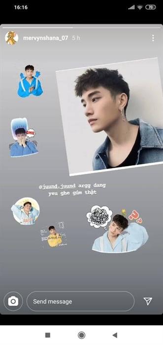 Bấm vào biểu tượng mặt cười hình vuông trong phần Tin nhắn hoặc Story. Gõ JUUN D vào ô tìm kiếm và chọn sticker muốn sử dụng.