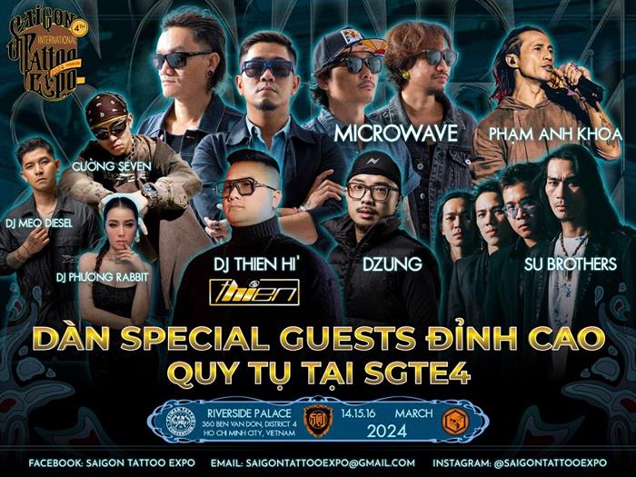 · Trình diễn nghệ thuật, âm nhạc đặc sắc cũng sẽ là 1 phần không thể thiếu tại Saigon Tattoo International Expo 2024. Các tiết mục âm nhạc mang âm hưởng dân gian đương đại và truyền thống sẽ được trình diễn liên tục trong 3 ngày của lễ hội. Sự có mặt của các khách mời đặc biệt như: DJ THIỆN HI’, CA SĨ CƯỜNG SEVEN, DZUNG GUITAR, BAND SU BROTHERS, BAND MICROWAVE, DJ MÈO DIESEL, DJ PHƯƠNG RABBIT…