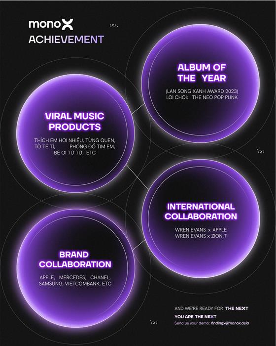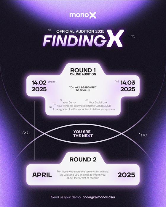 Đại diện truyền thông của monoX chia sẻ: “Chúng tôi nhìn thấy tiềm năng rất lớn từ thế hệ tài năng trẻ Việt Nam. Với sứ mệnh mang đến dòng nhạc chất lượng, đa dạng và mới mẻ, monoX quyết định mở rộng đội hình nghệ sĩ. Đây là thời điểm lý tưởng để chúng tôi tìm kiếm những viên ngọc thô và đào tạo họ trở thành những nghệ sĩ toàn diện, không chỉ về mặt âm nhạc mà còn cả phong cách, hình ảnh và tư duy nghệ thuật.”