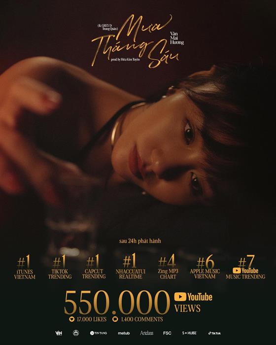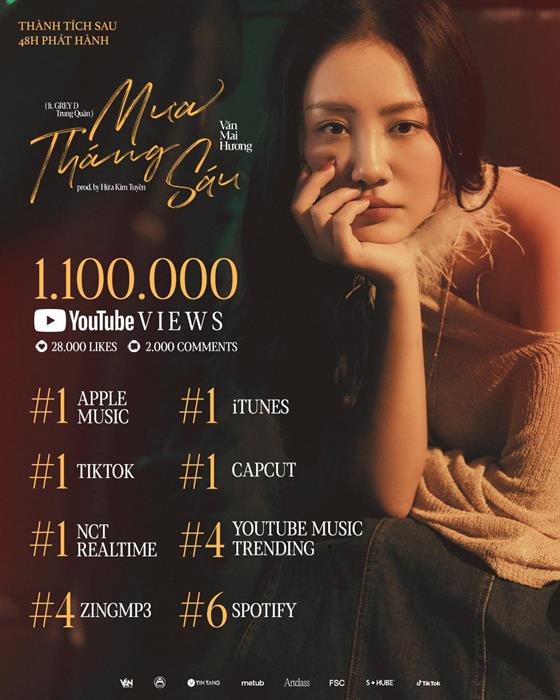 Đến 48h, MV “Mưa tháng sáu” của Văn Mai Hương vượt mốc hơn 1,1 triệu views, hơn 20 nghìn lượt yêu thích, hơn 2 nghìn bình luận và vươn lên vị trí #4 Youtube Music Trending. Đồng thời, bản audio dành riêng cho mùa mưa còn đạt thêm thành tích #1 Apple Music Vietnam, #6 Spotify.