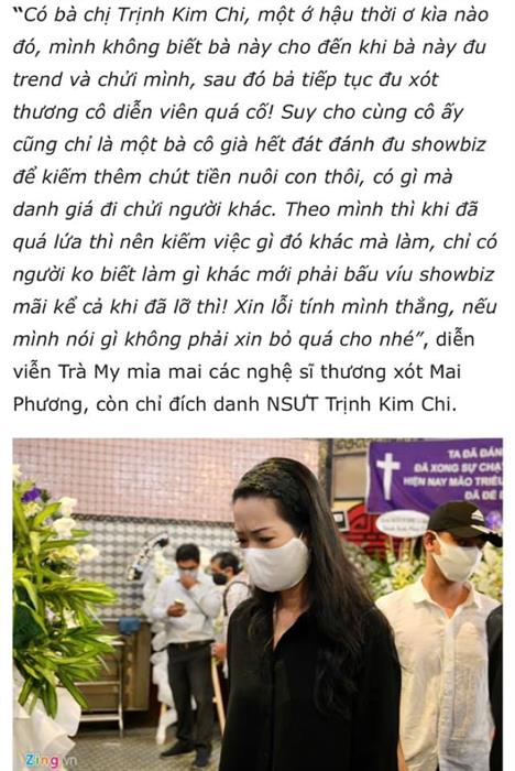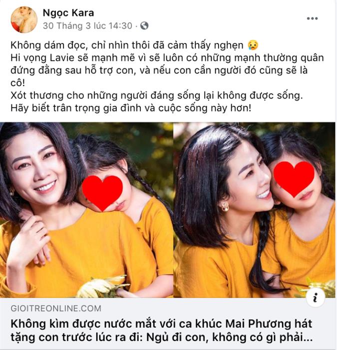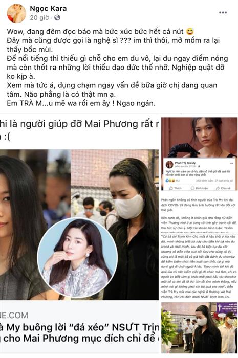 Theo dõi trang cá nhân của nữ ca sĩ Ngọc Kara, kể từ khi biết tin diễn viên Mai Phương qua đời vì căn bệnh ung thư và để lại đứa con nhỏ, giọng hát “Nhớ lắm đấy” đã bày tỏ tình cảm cũng như nỗi xót xa trước sự ra đi của “người đồng nghiệp”. Không những vậy, những ngày qua, Ngọc Kara bày tỏ sự bức xúc trước việc một nữ diễn viên trẻ tuổi khác, lợi dụng sự việc này để có những phát ngôn “gây sốc” và “khó nghe” đến cố diễn viên Mai Phương và NSƯT – Á hậu Trịnh Kim Chi…