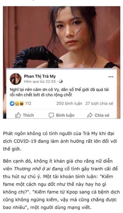 Gần đây, lợi dụng tình hình dịch bệnh Covid – 19 và sự ra đi của diễn viên Mai Phương, một diễn viên trẻ đã liên tục đăng tải những phát ngôn “phản cảm”. Trước hành động này, nhiều nghệ sĩ đã lên tiếng.