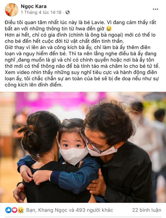 Liên lạc với nữ ca sĩ Ngọc Kara cô chia sẻ: “Bản thân tôi tuy không có quan hệ thân thiết với nữ diễn viên Mai Phương, nhưng cùng là phụ nữ, khi nhìn thấy hoàn cảnh của chị ấy tôi rất đồng cảm và quan tâm đến bé Lavie. Tôi cũng đang tìm cách để hỗ trợ và giúp đỡ cho bé Lavie, mong muốn bé sẽ có cuộc sống, tương lai tốt hơn sau này. Nên khi đọc được những dòng trạng thái của nữ diễn viên T.M, tôi thực sự cảm thấy rất bức xúc và khó chịu.”