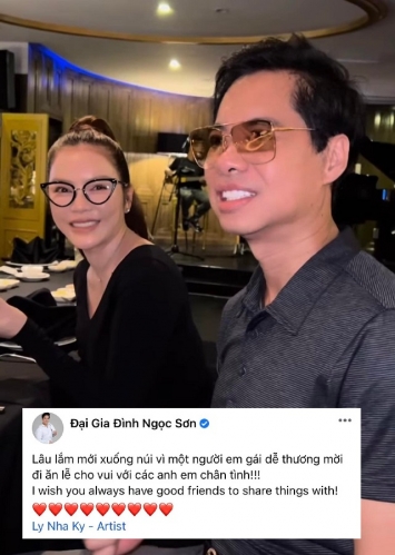 Dưới phần bình luận, Ngọc Sơn còn chia sẻ hình chụp chung vừa thân mật vừa nhí nhảnh với cựu đại sứ du lịch Việt. Cư dân mạng không khỏi bất ngờ trước mối quan hệ của “ông hoàng nhạc sến” và “đại gia kim cương” của showbiz Việt. Lý Nhã Kỳ và Ngọc Sơn có cơ duyên gặp gỡ từ rất nhiều năm về trước. Cả hai nhiều lần cùng tham gia gameshow, làm giám khảo cuộc thi sắc đẹp, cùng đi từ thiện… Dù không thường xuyên tương tác trên mạng xã hội nhưng trên thực tế, cả hai ngoài đời là bạn bè tốt, luôn ủng hộ nhau trên con đường sự nghiệp. Đáng chú ý, Ngọc Sơn còn tiết lộ Lý Nhã Kỳ chính là “nàng thơ” trong nhạc phẩm nổi tiếng của mình: Vầng trăng cô đơn.