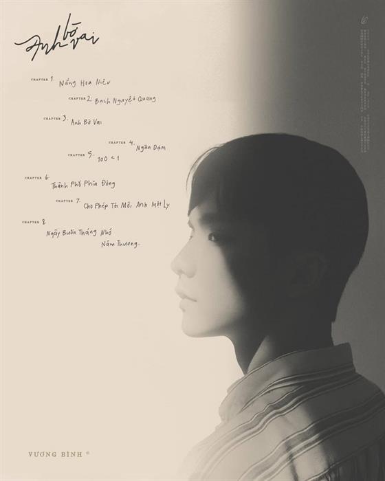 Bên cạnh ca khúc chủ đề ’Anh Bờ Vai’, album debut của Vương Bình còn bao gồm 7 ca khúc khác, vừa đọc tên đã đủ “lụi tim”: Nắng Hoa Niên, Bạch Nguyệt Quang, Ngàn Dặm, 100 < 1, Thành Phố Phía Đông, Cho Phép Tôi Mời Anh Một Ly và Ngày Buồn Tháng Nhớ Năm Thương. Tất cả đều được sáng tác và sản xuất âm nhạc bởi đội ngũ S.HUBE Label, tập hợp những tên tuổi đứng sau nhiều bản hit của Vpop trong thời gian qua như Hứa Kim Tuyền, Trid Minh, Kai Đinh, Đông Âu, TDK, GREY D, N.T.B, DuongK, 2pillz, WOKEUP, NewL, Minh Maximum, Đạt J.
