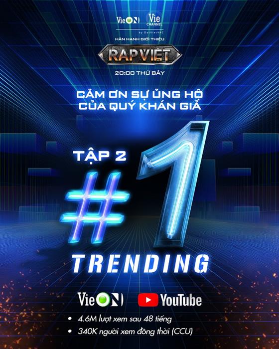 Màn chào sân đầy bùng nổ của Rap Việt 2024, ngay sau khi Tập 1 lên sóng đã lập tức có mặt ở vị trí Top 3 Trending YouTube, tập 2 đã tạo nên cơn sốt với hàng loạt những con số ấn tượng, vượt qua tập 1 và tiến thẳng Top 1 Trending Youtube. Tính đến thời điểm hiện tại (12h ngày 1/10), tập 2 Rap Việt 2024 xuất sắc thu về hơn 4,6 triệu lượt xem, gần 100 nghìn lượt thích và hơn 6 nghìn lượt bình luận trên kênh Youtube Vie GIẢITRÍ, khiến fan hâm mộ đứng ngồi không yên. Bên cạnh đó, Tập 1 của Rap Việt 2024 vẫn giữ vững phong độ khi nằm trong Top 6 Trending Youtube, khẳng định sức hút mạnh mẽ sau 4 mùa lên sóng