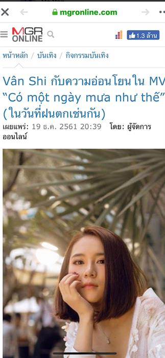 Tintuc - Mới đây, hình ảnh cùng MV mới của Vân Shi bất ngờ xuất hiện trên một trang báo nổi tiếng tại Thái Lan. Nữ ca sĩ nhận được nhiều lời ngợi khen về ngoại hình xinh đẹp cũng như nói về con đường mà cô đến với âm nhạc và hình ảnh của một hotgirl Trà Sữa Việt Nam.