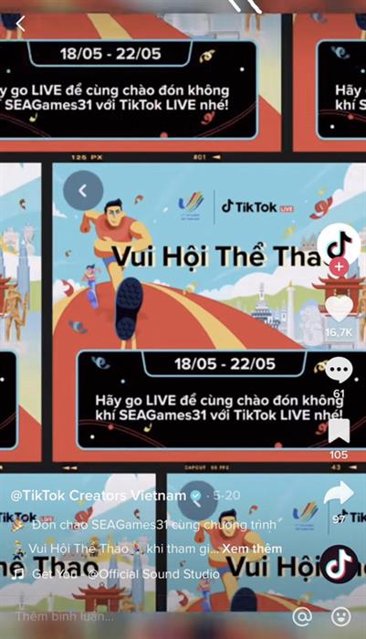 Hòa chung không khí sôi động và cuồng nhiệt của Đại hội Thể Thao Đông Nam Á lần thứ 31, TikTok LIVE đã triển khai chương trình Vui Hội Thể Thao diễn ra từ ngày 18/05. Trong khuôn khổ chương trình, người dùng có thể theo dõi trực tiếp các trận thi đấu đỉnh cao của các vận động viên hoặc các nội dung LIVE với đa chủ đề nhằm ủng hộ tinh thần đội tuyển Việt Nam. Đồng thời, các nhà sáng tạo nội dung có thể tham gia tương tác, hoàn thành các nhiệm vụ để nhận các phần thưởng hấp dẫn và thi đua ghi danh trên bảng xếp hạng. Chiến dịch đã ghi nhận con số ấn tượng với gần 40 triệu lượt xem trực tuyến và 132 triệu video đăng tải trên nền tảng.