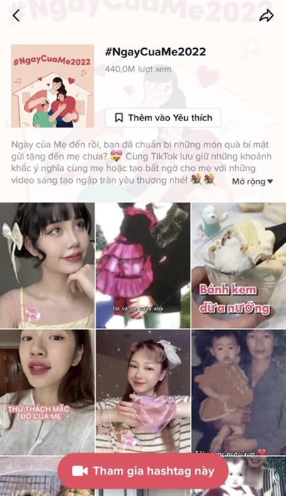 Tháng 5 vừa qua đã mở ra với hàng loạt những hoạt động ý nghĩa, đưa người xem đi qua mọi cung bậc cảm xúc từ hài hước đến xúc động với những video tri ân Ngày của Mẹ. Hashtag #NgayCuaMe2022 đã trở thành nơi lưu giữ những khoảnh khắc đặc biệt để cộng đồng thể hiện tình yêu thương, gửi gắm những lời chúc, sự quan tâm và lòng biết ơn đối với những người làm mẹ. Thu hút hơn 100 nghìn video tham gia sáng tạo và hơn 437 triệu lượt xem từ các thử thách như: phối đồ, trang điểm theo phong cách của mẹ hoặc tự tay vào bếp nấu ăn cho mẹ, hashtag đã góp phần lan tỏa rộng rãi những thông điệp ấm áp và giá trị tích cực đến với người dùng về tình cảm gia đình trong tháng qua.