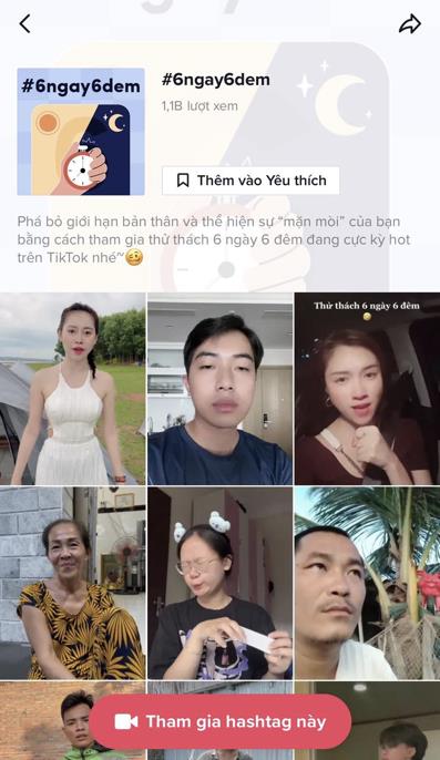 Vừa qua, cộng đồng TikTok được dịp "cười ra nước mắt" với hàng loạt thử thách hài hước và độc lạ thông qua hashtag #6Ngay6Dem. Xuất phát từ những video thử thách đậm chất thôn quê, câu nói “6 ngày 6 đêm… gét gô” của kênh Tới Trời Thần (@toi69n1), #6Ngay6Dem đã nhanh chóng gây sốt khắp các nền tảng, mang về hơn 100 nghìn video tham gia sáng tạo và gần 1 tỷ lượt xem. Với nội dung đơn giản và dễ thực hiện, người dùng có thể thỏa sức sáng tạo với những thử thách khó đỡ và mang lại những màn xử lý tình huống tuy vụng về nhưng không kém phần hài hước cho người xem.