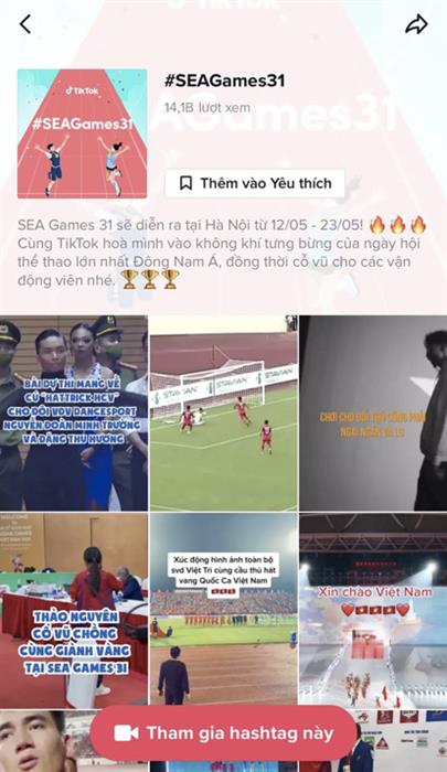 Tiếp nối niềm vinh dự khi trở thành đơn vị đồng hành chính thức của sự kiện thể thao lớn nhất khu vực - SEA Games 31, TikTok đã cho ra mắt hashtag #SEAGames31 để giúp cộng đồng những người yêu thể thao được cập nhật các kiến thức, theo dõi quá trình tập luyện, tương tác và cỗ vũ cho các vận động viên đang tranh tài tại giải đấu. Sự kiện khép lại không chỉ mang đến chiến thắng áp đảo của đoàn thể thao Việt Nam, mà còn là thắng lợi khi nói về mặt truyền thông với hơn 1 triệu video tham gia và gần 14 tỷ lượt xem trên nền tảng.