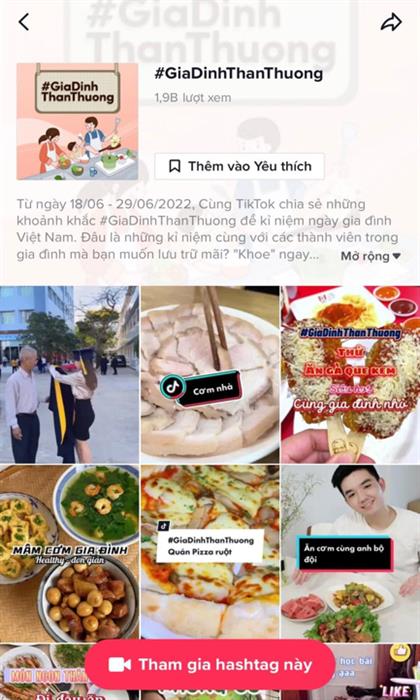 Với mong muốn lưu giữ và lan tỏa những khoảng khắc gia đình ấm áp, TikTok đã triển khai hashtag #GiaDinhThanThuong nhân dịp ngày Gia đình Việt Nam 28/6. Hashtag đã trở thành nơi để các thành viên được thể hiện tình yêu thương, chia sẻ hình ảnh về bữa cơm gia đình đầm ấm hoặc hành trình trở về quê hương vỡ òa cảm xúc. Những video ý nghĩa này dường như đã lan tỏa rộng rãi những giá trị tích cực về tình cảm gia đình, chiếm trọn trái tim của nhiều người xem với hơn 1,9 tỷ lượt xem và hơn 400 nghìn lượt video tham gia hưởng ứng.