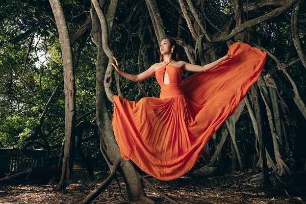 Chuyến đi đến với Vàm Cỏ Đông của Hoàng My thật đặc biệt. Nữ giám khảo của Hoa hậu Hoàn vũ Việt Nam 2022 di chuyển bằng thuyền và tận hưởng vẻ đẹp nên thơ của dòng sông đã nhiều lần đi vào thơ ca. Không để lỡ mất những khoảnh đẹp kỳ diệu mà thiên nhiên ban tặng, Á hậu Hoàng My và ekip đã cùng nhau đã ghi lại bức hình với bộ váy xếp ly màu cam vô cùng rực rỡ.