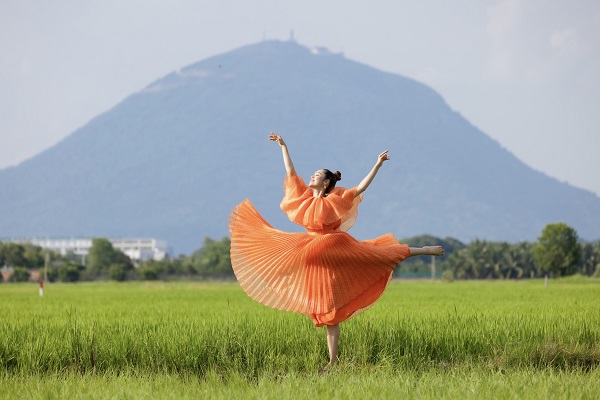 Tại đây, Hoàng My và ê-kíp đã cùng nhau ghi lại nhiều khoảnh khắc đẹp khi nàng hậu diện trên mình thiết kế váy xếp ly bồng bềnh, nữ tính. Nét rạng rỡ của nàng hậu, phong cảnh thanh bình, xanh mát trong loạt ảnh như thôi thúc người xem đến với Tây Ninh.