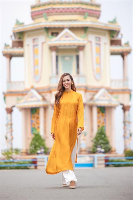 Diện trên mình thiết kế áo dài cách tân màu vàng rực rỡ, Hoàng My nhẹ nhàng khoe nhan sắc dưới ánh nắng chiều Tây Ninh. Đây cũng là một trong những shoot hình mà nàng hậu hài lòng nhất trong chuyến đi lần này.