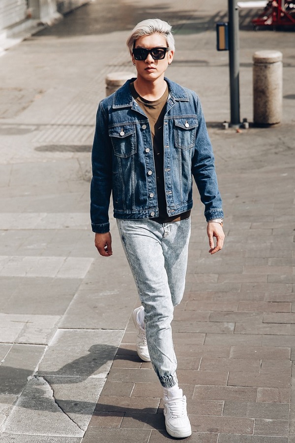 Brian Trần đốn tim các bạn nữ với vẻ ngoài lạnh lùng. Anh chàng chọn cho mình quần Jogger khỏe khoắn đi chung với áo khoác Jean nam tính.