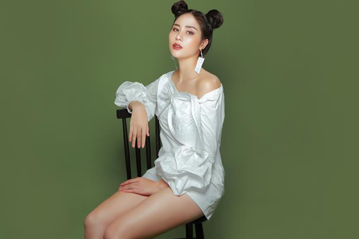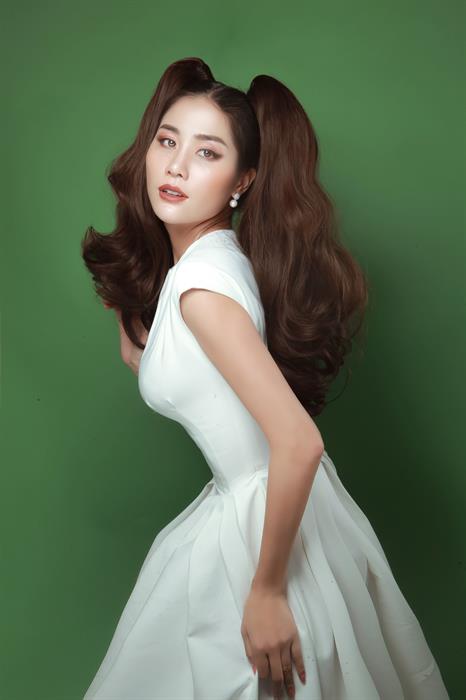 Ngoài ra, Hoàng Hạnh cũng thể hiện thêm kiểu tóc ‘khổng lồ’ khi buộc cao hai bên, uốn gợn sóng nhẹ nữ tính và lạ mắt.