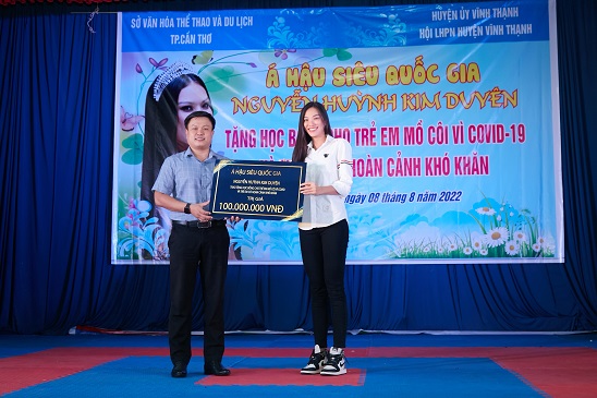 Vào ngày 8/8, Kim Duyên đã thực hiện hoạt động thiện nguyện đầu tiên sau khi đăng quang ngôi vị Á hậu 2 Hoa hậu Siêu quốc gia. Cần Thơ chính là điểm đến đầu tiên trong hành trình thiện nguyện của Kim Duyên. Được biết, chương trình “Trao 100 suất học bổng cho trẻ em mồ côi vì dịch COVID-19 và trẻ em có hoàn cảnh khó khăn” trên địa bàn huyện Vĩnh Thạnh do Thành phố Cần Thơ phối hợp với Sở VHTTDL thành phố tổ chức. Chương trình do Á hậu Kim Duyên tài trợ.