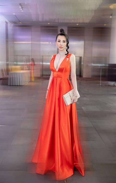 Ngay khi vừa xuất hiện, hoa hậu Châu Ngọc Bích đã thu hút sự chú ý của truyền thông và đông đảo khách mời. Đương kim Hoa hậu Đại sứ Quý bà Hoàn vũ diện chiếc đầm tông cam, chất liệu phi bóng cao cấp, tôn hình thể cân đối, điểm nhấn thu hút của trang phục là phần cổ xẻ sâu để lộ vòng 1 gợi cảm. Mái tóc búi hiện đại cùng tông trang điểm sắc nét đã giúp Châu Ngọc Bích tự tin trên thảm đỏ và trở thành tâm điểm sự kiện.