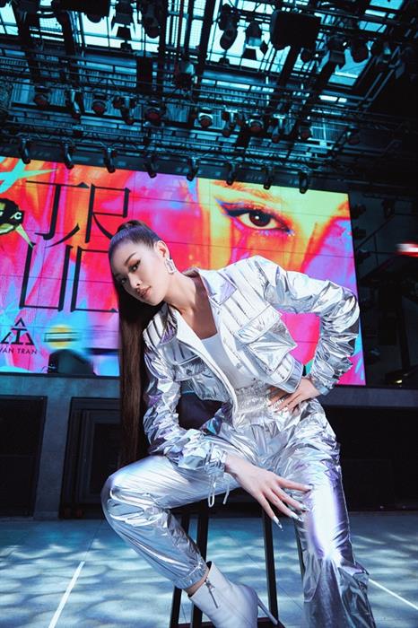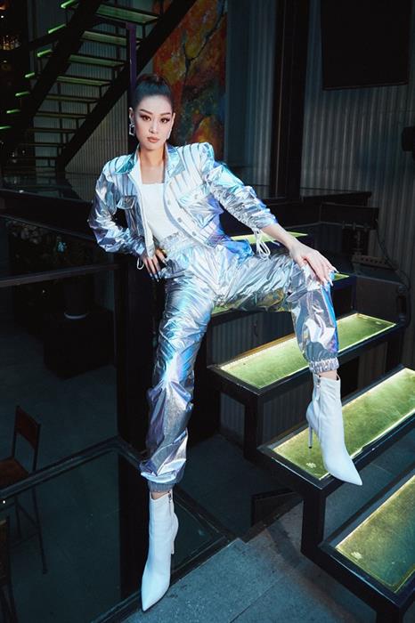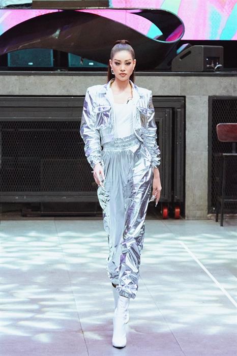 Hoa hậu Khánh Vân xuất hiện nổi bật với trang phục màu ánh bạc, áo siết eo kết hợp áo khoác cá tính cùng đôi boot mũi nhọn. Khác với phong cách beauty queen thường thấy, Hoa hậu Khánh Vân chọn hình ảnh năng động, hiện đại, mái tóc cột cao đuôi ngựa để tiếp thêm sức mạnh cho các người mẫu trẻ đến tham dự buổi casting.