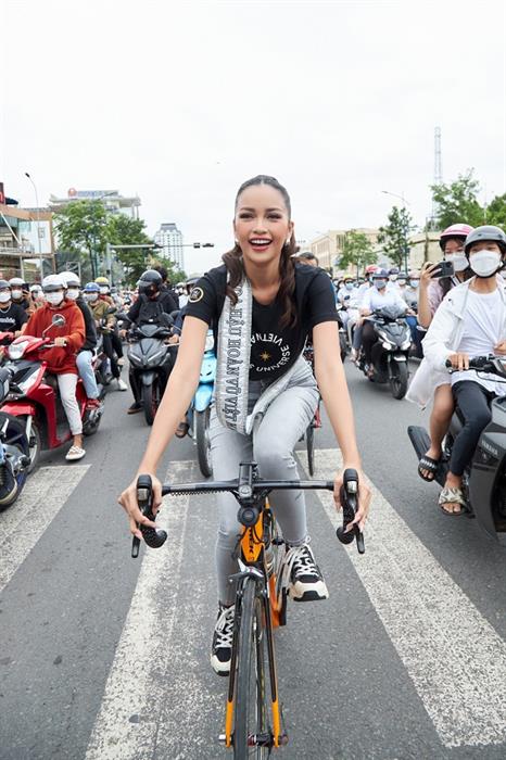 Không chỉ giúp tăng cường về sức khỏe, việc đạp xe đạp còn giúp tiết kiệm nhiên liệu từ thiên nhiên, hạn chế khí thải, góp phần bảo vệ môi trường. Đó chính là lý do Ngọc Châu và ê-kíp lựa chọn phương tiện này cho buổi diễu hành “HomeComing” của Tân Hoa hậu Hoàn vũ Việt Nam.