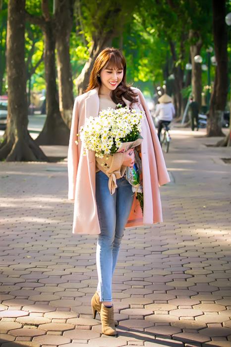 Tạm quên những bộ váy dạ hội rực rỡ, vẻ đẹp tinh khôi tuổi đôi mươi của Hoàng Kim được tôn lên qua những trang phục quần jean, áo dệt kim đơn giản. Thay cho hình ảnh đương kim hoa hậu quý phái, cô nàng thu hút mọi ánh nhìn với nét xinh tươi của một cô gái Sài Thành vừa năng động vừa nữ tính. Với một chiếc áo khoác hờ, Hoàng Kim lại mang vẻ đẹp mơ màng, ngọt ngào như một thiếu nữ Hà Nội.