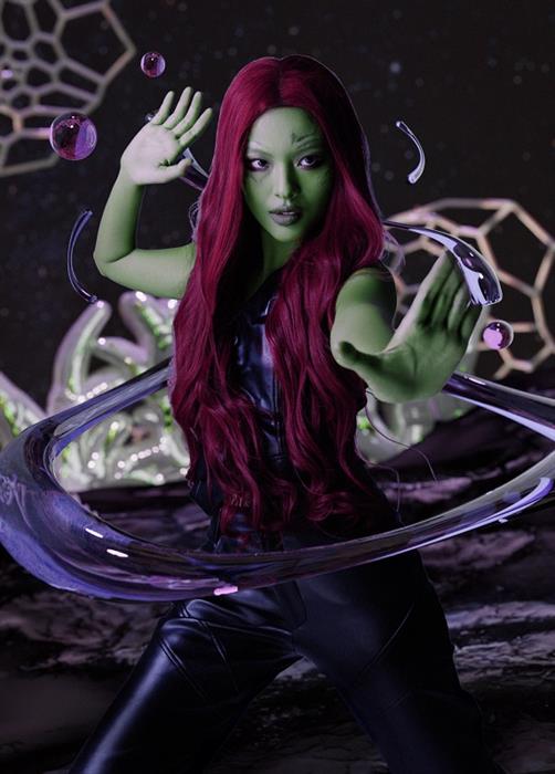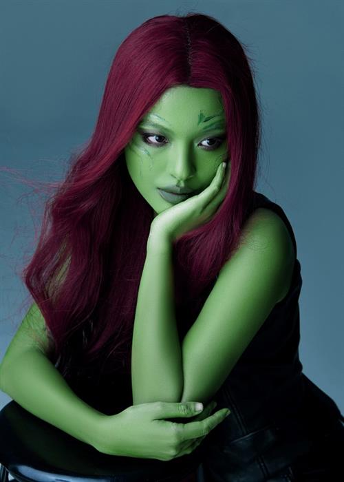 Nhân vật đầu tiên mà Tú Hảo chọn hóa thân đó chính là Gamora – nhân vật được yêu thích trong loạt siêu anh hùng của Marvel Studio. Sẽ không ngoa khi nhận xét Tú Hảo cũng sở hữu vẻ sexy chết người không chê vào đâu được khi hóa thân thành “cô nàng xanh” này. Đặc biệt với nhân vật Gamora, Tú Hảo còn sử dụng hiệu ứng vẽ tranh 3D khiến bức ảnh thêm phần sinh động và sắc nét. Quán quân The Face 2017 cho biết khi hóa thân Gamora, điều khó khăn chính là phải nhuộm da. “Hôm đó studio Hảo chụp hình còn bị cúp điện. Cả ekip phải rọi đèn flash hỗ trợ ánh sáng để anh make up hóa trang cho Hảo. Đúng là một kỷ niệm khó quên cho buổi chụp Halloween năm nay”, Tú Hảo tâm sự.