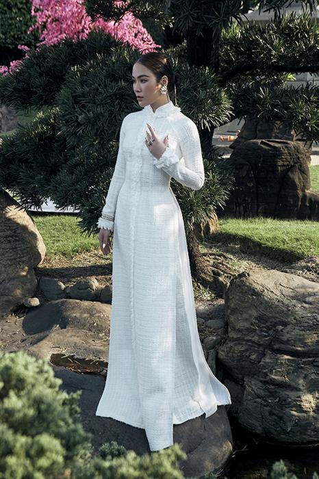 Với bộ áo dài màu trắng đơn giản bó sát từng đường cong cơ thể, người đẹp gây ấn tượng với vóc dáng ba vòng quyến rũ, cánh tay thon dài duyên dáng. Phần twist giữa áo và cổ tay áo mới lạ giúp bộ trang phục trở thành sản phẩm hoàn hảo giữa sự giao thoa giữa nét truyền thống kín đáo và nét hiện đại hợp thời trang.