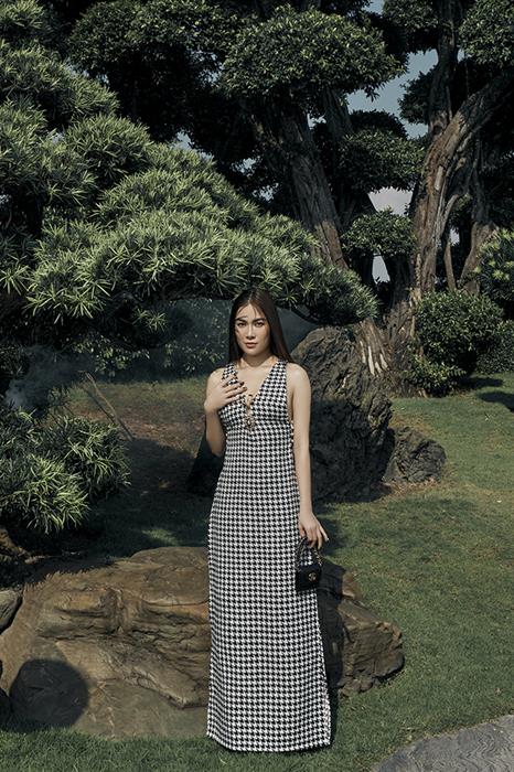 Sang kiểu áo dài sát nách suông cổ áo chữ V, Tuyết Nga một lần nữa chứng minh cô có thể “cân” được mọi kiểu áo dài. Lối trang điểm và kiểu tóc xõa tự nhiên, với màu áo ca rô trắng đen kết hợp cùng phụ kiện túi đeo chéo mini đem đến cho cô vẻ đẹp năng động hiện đại lôi cuốn.