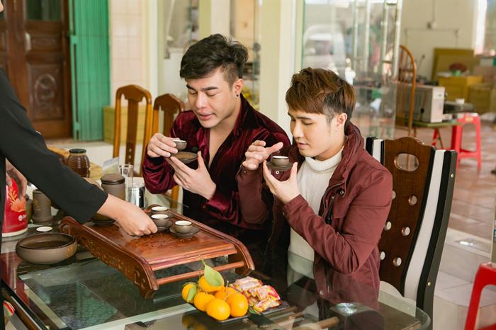 Huỳnh Lập và Dương Lâm khi đến đây đã vô cùng hào hứng vì được trải nghiệm làm và ăn tại chỗ món bánh chưng ngon trứ danh Thái Nguyên này. Trong tiết trời se lạnh của những ngày cuối năm nhưng được ăn bánh chưng ngon khiến Huỳnh Lập và Dương Lâm như cảm thấy không khí Tết đang tràn về.