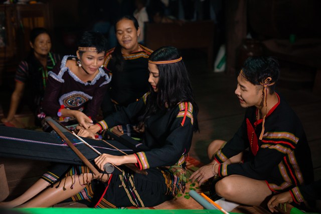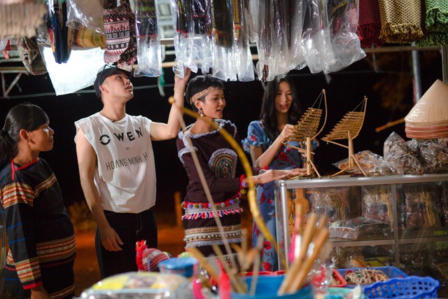 Cả nhóm còn được thưởng thức nghệ thuật với màn trình diễn cồng chiêng – vốn là một nghệ thuật văn hóa độc đáo ở Tây Nguyên, được Unesco công nhận là Di sản văn hóa phi vật thể. Hoàng Thùy còn được người dân địa phương dạy múa. Ngôi nhà sàn trong buôn sáng bừng và nhộn nhịp trong những tiếng cồng chiêng cùng những điệu nhảy duyên dáng.