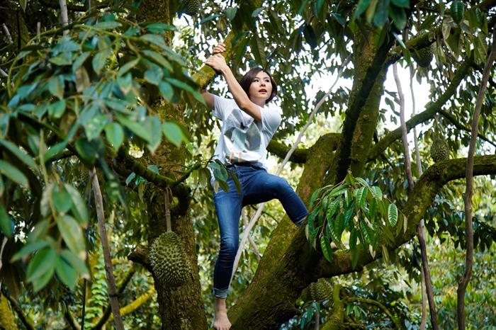 Đến với vườn sầu riêng ở Cù lao Ngũ Hiệp, Lý Hải, Minh Hà cùng Vân Trang như được thỏa sức đắm mình trong vườn sầu riêng rộng lớn thơm nức. Sầu riêng Ngũ Hiệp ở Tiền Giang nổi tiếng khắp cả nước bởi sự đặc biệt với vỏ mỏng, vị béo, hạt lép, trái ngọt thơm thơm mà bùi bùi . Quá thích thú, Vân Trang cũng nhanh chóng leo lên cây đầy chuyên nghiệp hái sầu riêng trong sự ngạc nhiên của vợ chồng Lý Hải.