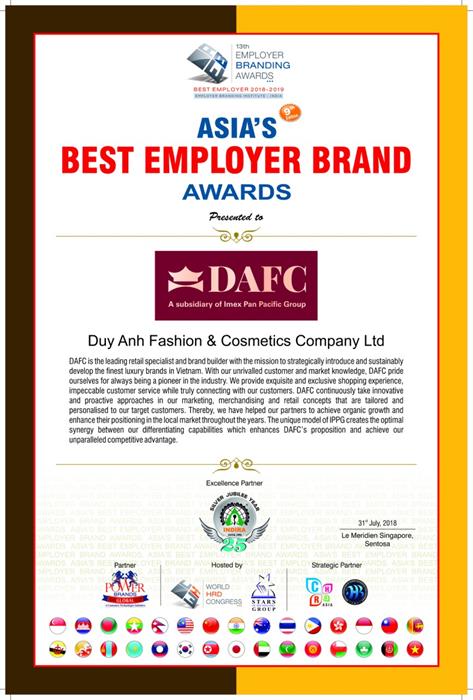 Tintuc - Vừa qua, Công ty TNHH Thời Trang và Mỹ Phẩm Duy Anh (DAFC) – nhà phân phối hàng hiệu hàng đầu Việt Nam được vinh danh cùng 100 công ty khác toàn châu Á. Đây là giải thưởng Asia’s Best Employer Brand Awards 2018 (Thương hiệu tuyển dụng tốt nhất Châu Á năm 2018) tổ chức tại Singapore.
