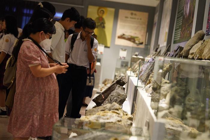 Các em học sinh trường Quốc học Huế tò mò các mẫu vật tại triển lãm Hóa thạch