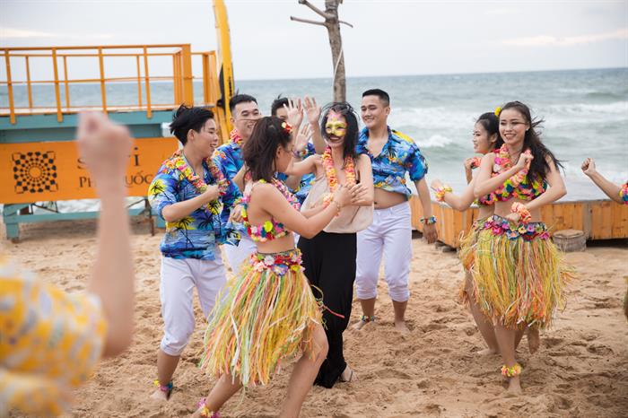Không chỉ bất ngờ xuất hiện bằng điệu múa Hawaii giữa bãi biển Phú Quốc, Thủy Tiên còn chiêu đãi dàn nghệ sỹ Ngô Kiến Huy, Khả Như, Quang Trung, Huỳnh Lập bằng bữa tiệc nướng hải sản tại bãi biển. Khả Như cũng không giấu nổi sự phấn khích khi được hội ngộ Thủy Tiên bởi vốn nữ diễn viên từng được mệnh danh là “bản sao Thủy Tiên” vì những đường nét trên gương mặt có phần hao hao. Vừa thưởng thức hải sản, các nghệ sỹ cứ thế trò chuyện đầy sôi nổi giữa bãi biển.