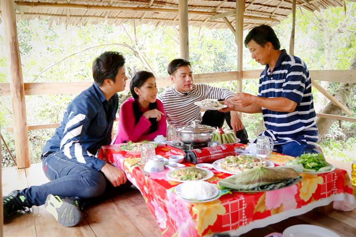 Không chỉ được thưởng thức trái cây, Võ Minh Lâm cùng Dương Lâm và Phượng Loan còn được người dân thân thiện, hiếu khách tiếp đãi bằng bữa tiệc thịnh soạn với những món đặc sản nơi đây như: Gỏi mít, Măng xào tép, Gà xé bưởi, Cá lóc nướng trui, Cá lóc bay, Cá nấu mẵn, Cá thác lác rút xương chiên nước mắm... đặc biệt món Lục bình xào tép được chính bộ 3 đích thân chèo xuồng đi hái trực tiếp từng lá lục bình tươi ngon mang về làm nguyên liệu chế biến. Bữa cơm đặc sản miền Tây cùng người dân Cồn Sơn ấm áp và giản dị với những câu chuyện vui nhộn, những chia sẻ thú vị, NSƯT Phượng Loan còn cùng Võ Minh Lâm ngẫu hứng với những câu đờn ca tài tử, cải lương trong không gian êm ả miền sông nước.
