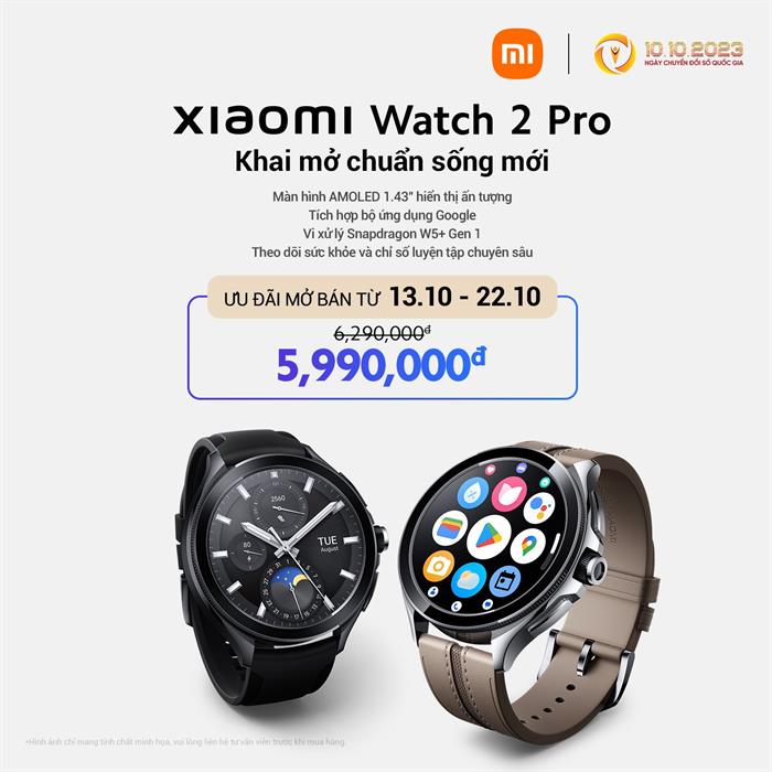 Ngày 28 tháng 9 năm 2023 – Xiaomi chính thức ra mắt Đồng hồ thông minh Xiaomi Watch 2 Pro tại thị trường Việt Nam. Thiết bị sử dụng hệ điều hành Wear OS do Google phát triển, mang đến hàng loạt trải nghiệm thông minh, tiện lợi. Đặc biệt, hiệu năng nhanh như chớp với sự hỗ trợ của vi xử lý Snapdragon® W5 + Gen 1, thời lượng pin dài, màn hình sắc nét cùng thiết kế bền bỉ từ thép không gỉ sẽ đáp ứng mọi nhu cầu tập luyện của người dùng.