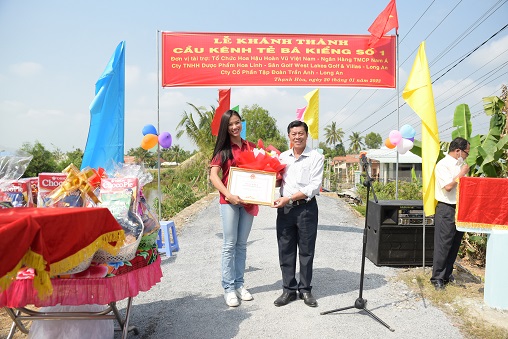 Tại huyện Bến Lức, với mong muốn góp phần vào việc xây dựng Cầu bắc qua kênh lưu thông, cải thiện đời sống sinh hoạt và kinh tế cho người dân, Á hậu Kim Duyên cùng các đại diện đã tổ chức buổi Lễ trao Cầu, chính thức khánh thành và đưa vào sử dụng 3 chiếc cầu gồm Cầu Kênh Bà Kiểng Bờ Bắc số 1, Cầu Kênh bà Kiềng bờ Bắc số 2 với quy mô dài 08m; rộng 03m; kết cấu cầu bê tông cốt thép. Tại huyện Mộc Hoá là Cầu Bà Quyền, dài 32 m, ngang 2m lọt lòng 1.8 m. Tất cả 3 công trình đều do tổ chức Hoa hậu Hoàn vũ Việt Nam xây dựng, sau lễ khánh thành sẽ được đưa vào sử dụng chính thức.