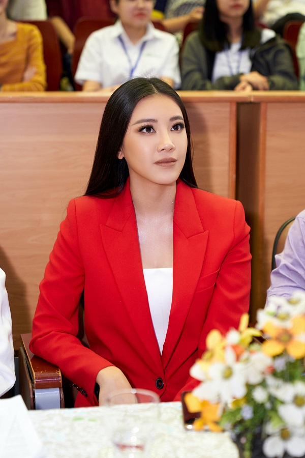 Diện vest đỏ thanh lịch, Á hậu Kim Duyên nhanh chóng thu hút sự chú ý của sinh viên có mặt trong hội trường bằng sự tự nhiên khi nói chuyện, cô không ngại nói đến những vấn đề ít người dám lên tiếng.