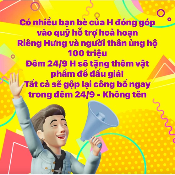 Tintuc - Ngoài 100 triệu của Đàm Vĩnh Hưng và gia đình, ca sĩ Lệ Quyên, đạo diễn Trần Vi Mỹ, đoàn lô tô Hương Nam của nghệ sĩ Su Su,… đã đóng góp cho show ca nhạc gây quỹ “Đêm yêu thương” do nam ca sĩ kết hợp với phòng trà Không Tên khởi xướng.