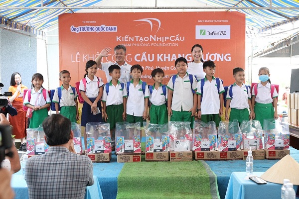 Hoạt động trao quà tặng các em học sinh vượt khó học giỏi tại lễ khởi công cầu Khang Vượng ngày 19/06
