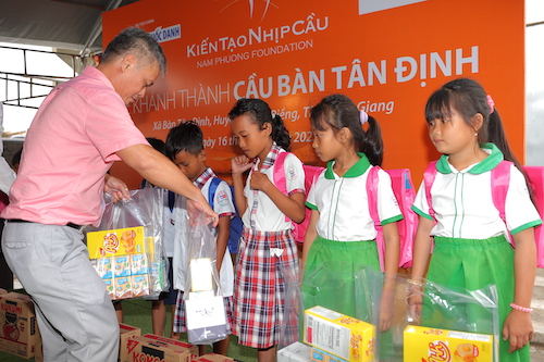 Đại diện nhà tài trợ Trương Quốc Danh trao tặng quà cho các em học sinh vượt khó học giỏi trong lễ khánh thành cầu Bàn Tân Định (Kiên Giang)