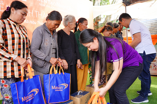 Đại diện Công ty Cổ phần Hàng tiêu dùng Masan trao tặng quà cho người dân tại lễ khánh thành cầu Khang Phúc (Tiền Giang)