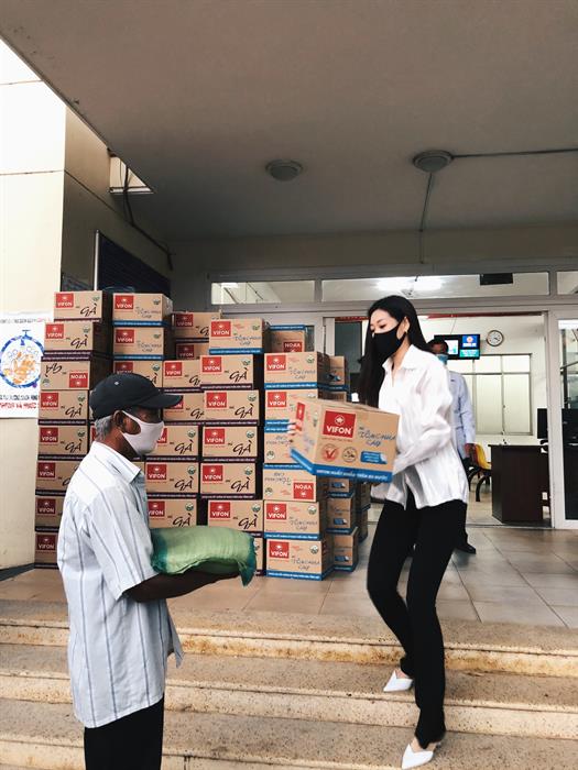 Đồng hành cùng Hoa hậu Khánh Vân đi trao quà chính là mẹ cô. Mẹ là người luôn bên cạnh Hoa hậu Khánh Vân trong các sự kiện thiện nguyện cộng đồng, xã hội. Trước đó, hai mẹ con đã cùng phát nước rửa tay cho người dân khu vực phường 22, quận Bình Thạnh, TPHCM.